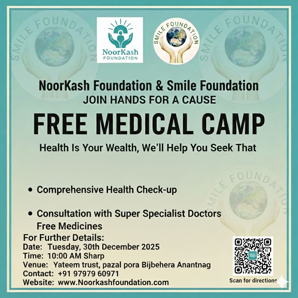 Kashmir Free Medical Camp Noorkash Foundation December 28, 2025 0 Noorkash Foundation NoorKash Foundation, in collaboration with Smile Foundation, invites everyone to attend a Free Medical Camp on 30th December 2025 at Yateem Trust, Pazal Pora, Bijbehara, Anantnag 10:00 Am onwards . Post navigation Previous: NoorKash Foundation Team Awarded Certificate of Participation at TEDx DalLakeNext: Noorkash Foundation, Smile Foundation Organise Free Medical Camp for Orphans at Bijbehara More Stories Kashmir NoorKash Foundation Organises Iftar for Orphans at Yateem Trust, Vessu Anantnag Noorkash Foundation March 18, 2026 0 Kashmir NoorKash Foundation at NGO–CSR Enclave, VYK Delhi Noorkash Foundation February 27, 2026 0 Kashmir Noorkash Foundation, Khanqa-e-Hydari Organise Free Medical Camp in Akad Anantnag Noorkash Foundation January 1, 2026 0 Leave a Reply Cancel replyYour email address will not be published. Required fields are marked *Comment * Name * Email * Website Save my name, email, and website in this browser for the next time I comment.